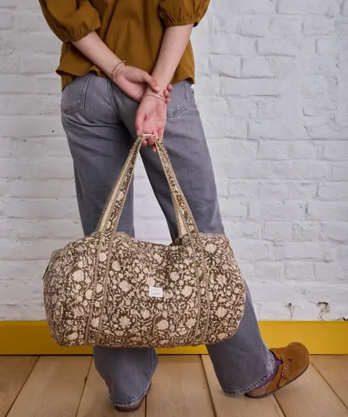 accessoires : grand sac de voyage femme matelassé, trousse de toilette femme en coton matelassé et carnets recouverts de tissu block print, qui allient utilité et esthétique.